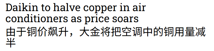 而在空调行业,什么国际顶流大金空调,也早早地就与日本铝业巨头UACJ合作,开发了专用的耐腐蚀铝合金材料,还在2021年宣布,计划到2025年将全球空调产品中的铜使用量减少50%。