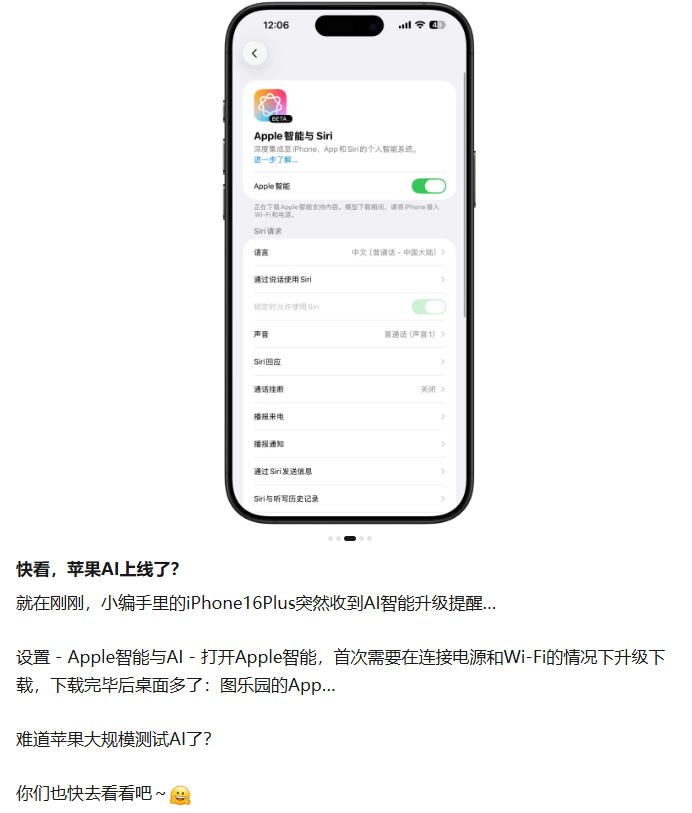 因此,网传“苹果AI国行版开启灰测”的说法可信度并不高,个别用户收到相关提醒,更可能与此前使用第三方工具强行开启AI功能有关。
