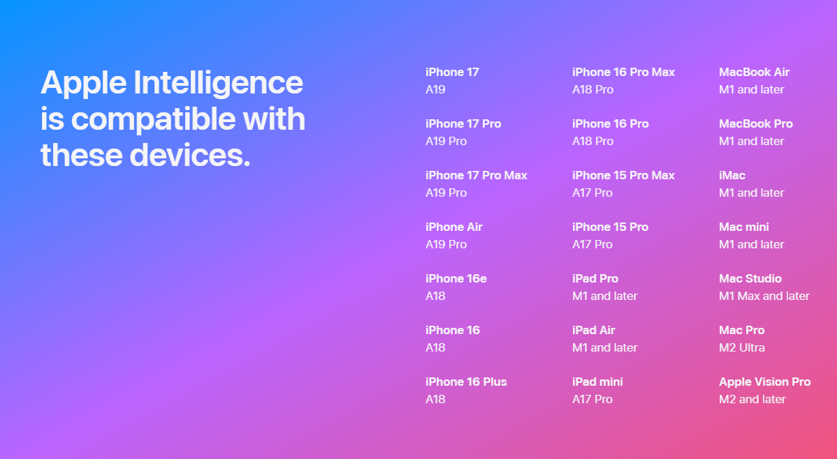 苹果官网显示,Apple Intelligence(苹果智能)目前仅支持iPhone 15 Pro系列及后续机型。