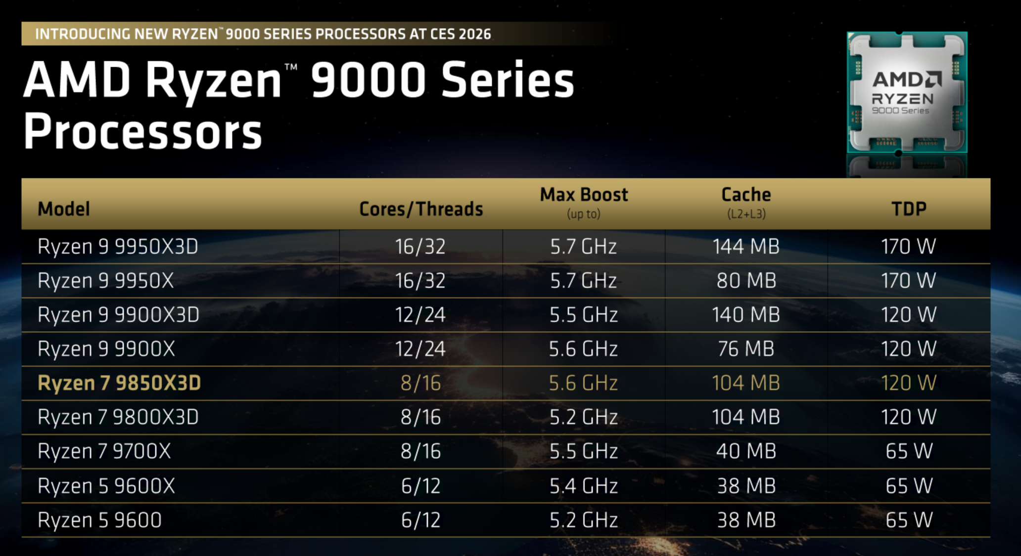 CES 2026大展上,AMD正式发布了锐龙9000系列的新成员“锐龙7 9850X3D”,也就是一代神U锐龙7 9800X3D的升级版。锐龙7 9850X3D依然还是台积电4nm CCD、6nm IOD组成,拥有8核心16线程、8MB二级缓存、32MB原生三级缓存、64MB 3D缓存,合计104MB缓存,集成2单元GPU。