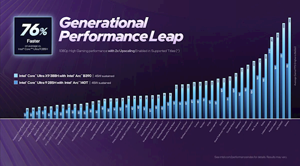 Intel表示,Core Ultra X9 388H在Cinebench 2024测试中,多线程性能比Core Ultra 9 288V提升达60%(两款芯片的功耗均为25W的条件下)。此外,与Core Ultra 9 285H 相比,Core Ultra X9 388H 的游戏性能提升高达76%。(该数据来自45款游戏平均值测试,测试在1080p分辨率下进行,并在支持XeSS的游戏中开启了2倍分辨率缩放。)