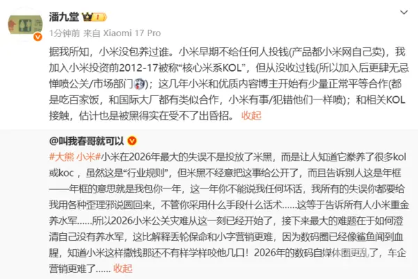近年来小米与优质内容博主开始有少量正常且平等的合作,这些博主并非只与小米合作,而是“吃百家饭”,与国际大厂也有类似合作,并且当小米出现问题或犯错时,他们同样会进行批评。潘九堂推测,小米此次与相关KOL接触,估计是因被恶意抹黑,实在难以忍受才出此昏招。