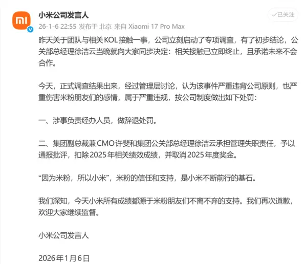 据CNMO了解,近日,针对团队与相关KOL接触一事,小米管理层经过讨论后认定,该事件严重违背了公司的原则,也严重伤害米粉朋友们的感情,属于严重违规。基于此,小米依据公司制度作出严肃处罚决定:涉事负责经办人员,做辞退处罚;集团副总裁兼CMO许斐和集团公关部总经理徐洁云承担管理失职责任,予以通报批评,扣除2025年相关绩效成绩,并取消2025年度奖金。