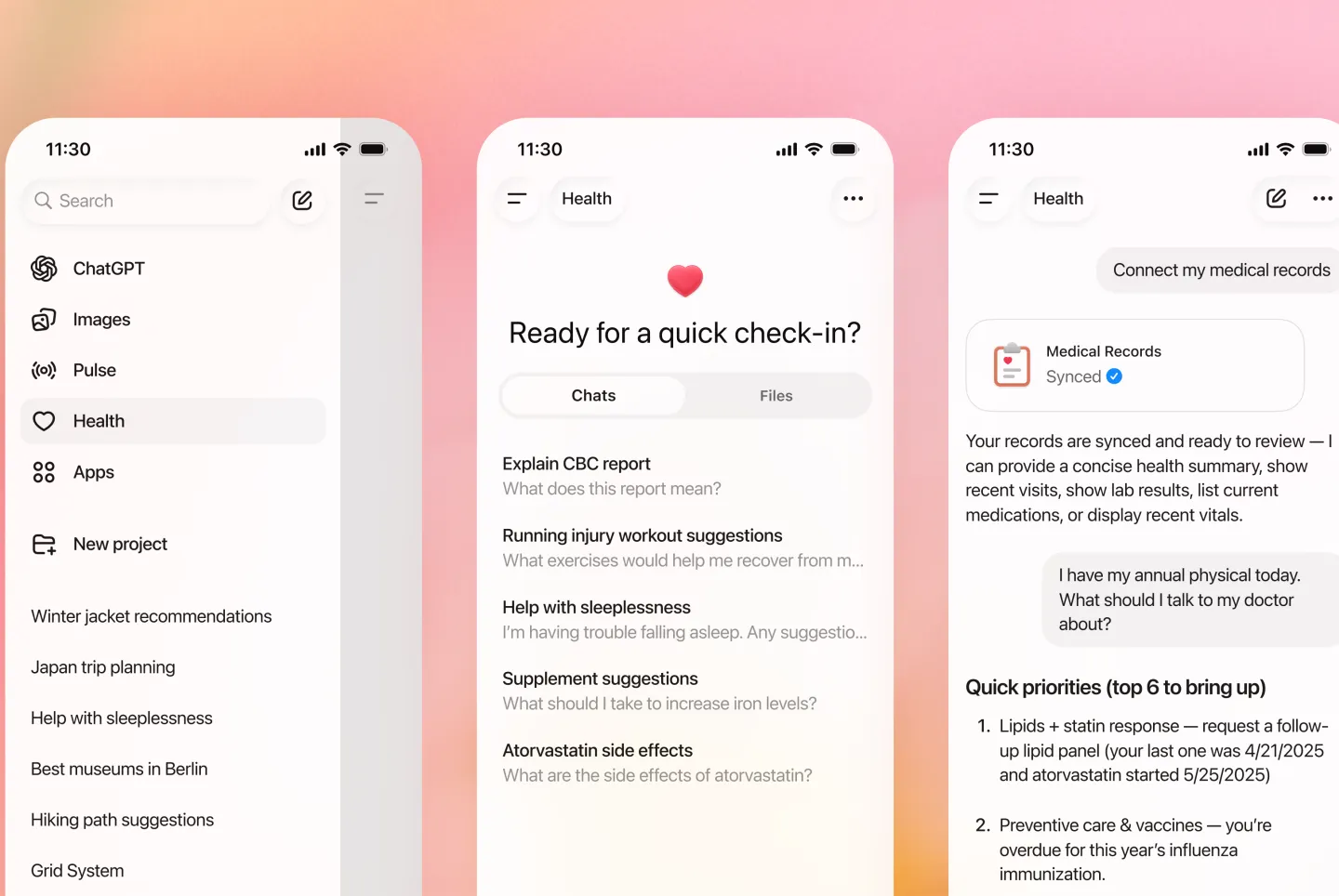 OpenAI 表示,ChatGPT Health 将鼓励用户接入个人医疗记录以及多种健康与健身应用,以便模型在更充分的背景信息基础上生成回答。官方举例称,用户可连接 Apple Health、Peloton、MyFitnessPal、Weight Watchers 以及 Function 等服务,由此让 ChatGPT 获取包括运动、睡眠、活动模式在内的健康与健身数据,并结合饮食记录和实验室检测结果,为用户提供更具针对性的建议。在医疗记录层面,OpenAI 建议用户授权上传检查结果、就诊小结和既往病史等内容,以便模型帮助解释相关信息。