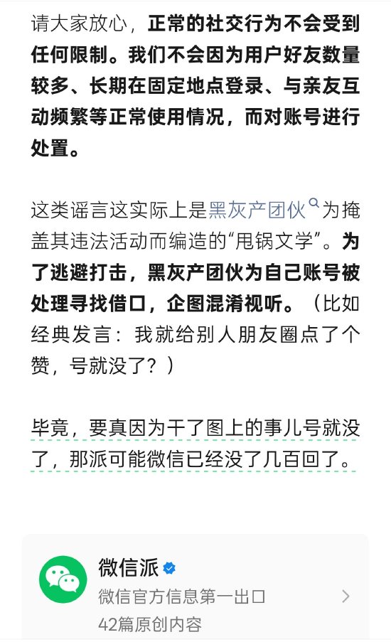 今日,微信官方再次发文辟谣表示,正常的社交行为不会受到任何限制。微信官方提到,我们不会因为用户好友数量较多、长期在固定地点登录、与亲友互动频繁等正常使用情况,而对账号进行处置。