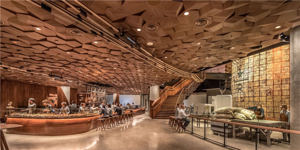 2017 年,星巴克就在上海南京西路开了个 2700 平米的臻选烘培工坊,搬来了咖啡烘焙流水线,还砸钱做了 N 多细节,比如顶部设计了 “ 咖啡交响管 ” ,烘培好的生豆通过管道乒乒乓乓的最后掉落到吧台的储豆罐里。
