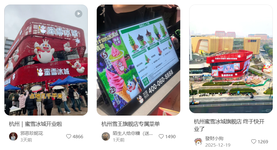 不仅如此,在过去的 2025 年,蜜雪冰城开了十多家旗舰店,从郑州开到了杭州、成都、重庆、青岛、石家庄、西安、武汉等等,到处 “ 攻打 ” 省会。