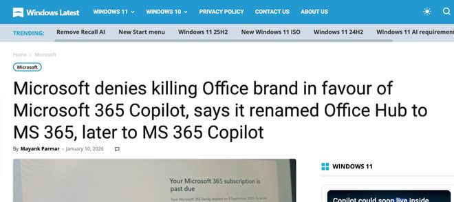 实际情况是,微软多年来一直在逐步推动“Office”作为消费级品牌的隐退,转而推广Microsoft 365品牌——它至今仍是Microsoft 365,而非Microsoft 365 Copilot。“Office”这一名称目前仍出现在部分场景中,例如Office 2021 LTSC版本,同时也常被用来指代Microsoft 365订阅中包含的Office应用程序。