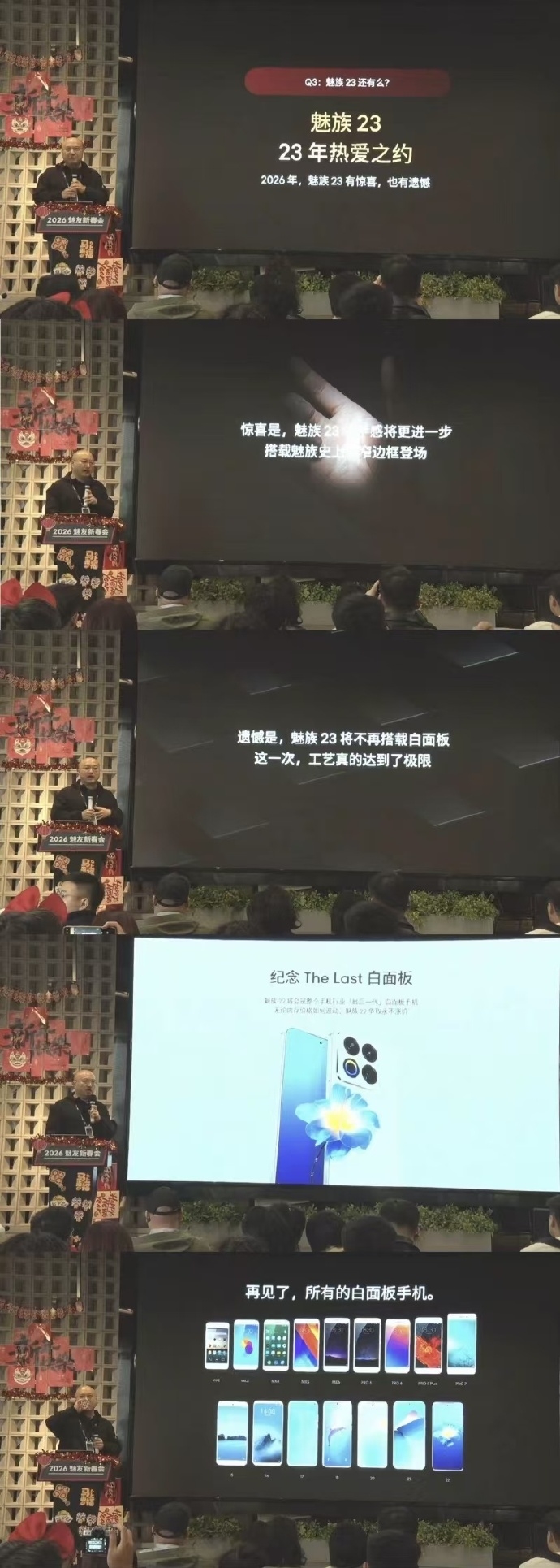 在2026魅友新春年会上,星纪魅族集团中国区CMO万志强预告,今年魅族将会推出年度旗舰魅族23,称“魅族23有惊喜也有遗憾”。万志强表示,魅族23的惊喜是其手感更进一步,搭载魅族史上最窄边框,遗憾是魅族23不再采用白色面板,这一次工艺真的达到了极限。