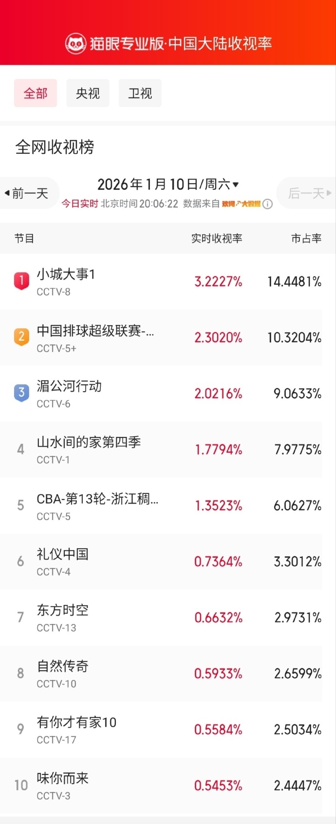 今天,由赵丽颖、黄晓明领衔主演的年代剧《小城大事》正式登陆中央电视台电视剧频道,并在腾讯视频全网独播。开播首日便斩获全网收视冠军,据猫眼专业版实时数据显示,该剧在CCTV-8播出的首集实时收视率达3.2227%,市占率14.4481%。