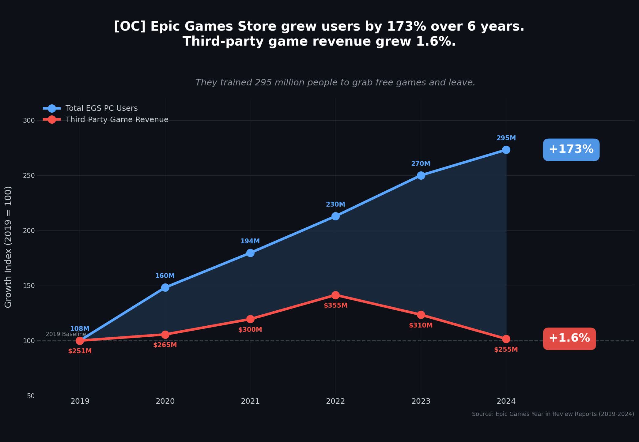 根据Epic历年年终回顾整理的数据,2019年至2024年间,Epic游戏平台上第三方游戏的消费总额仅增长约1.6%,几乎原地踏步。第三方游戏收入在2019年为2.51亿美元,2022年曾攀升至3.55亿美元,同比2021年增长18%,但随后连续两年下滑:2023年降至3.1亿美元,减少13%,2024年再跌18%,最终较2019年仅多出400万美元。与此形成鲜明对比的是,同期Epic PC端用户数量从2019年的1.08亿增至2024年的2.95亿,五年累计增幅达到173%。