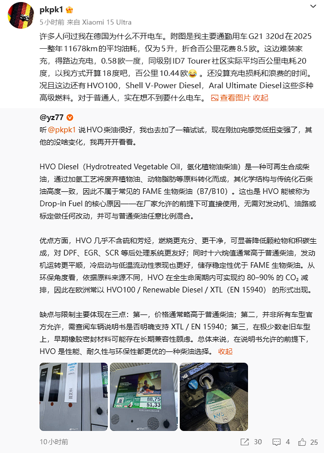 他还补充称,这边还有HVO100、Shell V-Power Diesel、Aral Ultimate Diesel这些多种高级燃料,“对于普通人,实在想不到要什么电车。”