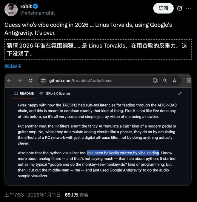 “猜猜2026年谁在氛围编程……是Linus Torvalds,在用Google的Antigravity。这下没戏了(It's over)。”