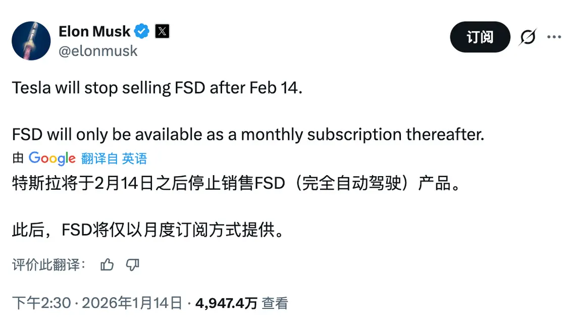 马斯克宣布FSD改为订阅制