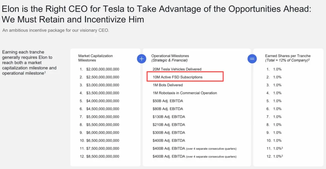 根据特斯拉的股东委托书,马斯克的薪酬方案共有四个产品目标,其中第二项就是:“实现1000万个活跃FSD订阅”。
