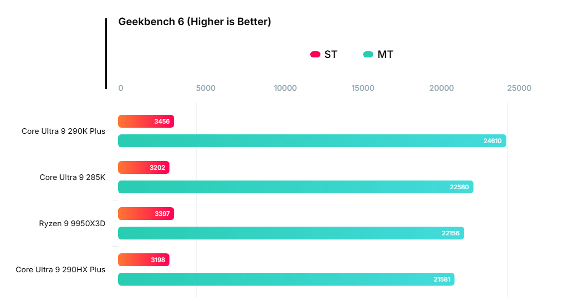作为一款移动芯片,酷睿Ultra 9 290HX Plus的多核性能已经极为接近桌面级旗舰AMD 锐龙9 9950X3D(22156 分)和自家酷睿Ultra 9 285K(22580 分)。