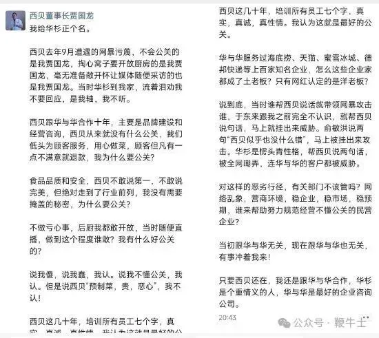 贾国龙回忆,西贝于去年9月遭遇网暴污蔑,彼时凡为西贝发声者均会遭到网暴攻击,华杉因出面支持西贝,不仅自身被全网嘲弄,其执掌的华与华公司的客户也受到连带威胁。