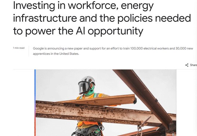 Google去年宣布向电气培训联盟捐了一笔钱(金额未公开),目标是到2030年帮10万名现有电工提升技能,并培训3万名新学徒。