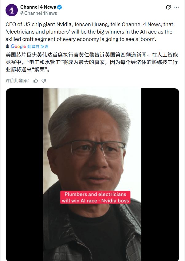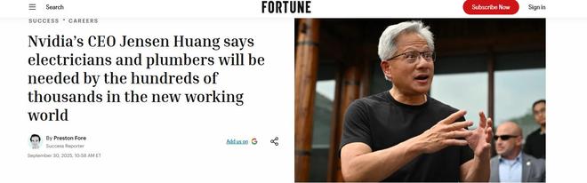 甚至就连英伟达CEO黄仁勋都公开喊话:年轻人别扎堆学计算机了,去当电工、管道工吧,“我们需要数十万人”。