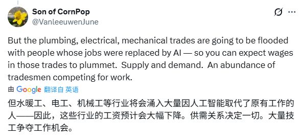 这或许代表了不少年轻人开始“务实”择业的心态。但也有网友提醒别太乐观:一旦水暖工、电工行业涌入大量被AI取代的人,竞争也会导致工资下降,“供需决定一切”。
