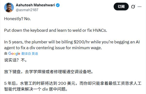 网友们的看法则更接地气。有人一针见血地指出:去学焊接或者修空调吧,5年后时薪或达200美元!