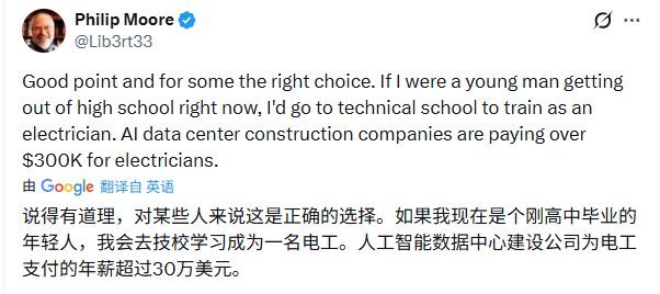 这说明,不仅是AI,高端制造业、航天等领域都在抢同一批技术工人。当然,也有人直接给出建议,如果现在高中毕业,更应该去技校学电工,毕竟AI数据中心给电工开的年薪高达30万美元。