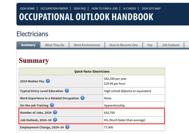 美国劳工统计局预计,未来十年美国平均每年短缺约8.1万名电工,就业缺口远高于所有职业平均水平。