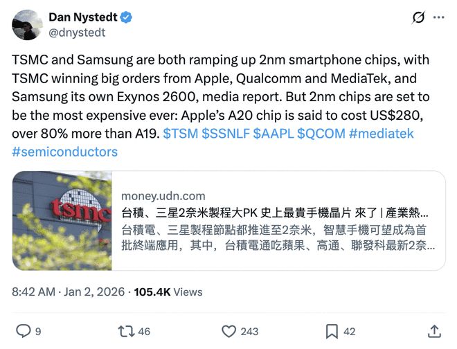 行业分析师报告称,2纳米晶圆的定价高达每片3万美元,比2万美元的3纳米价格高出50%。这意味着,A20芯片的单颗成本将飙升至280美元,几乎是前代A19的两倍。