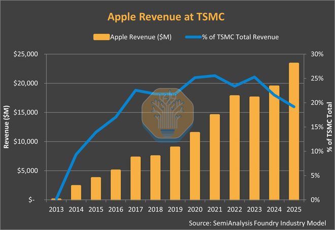 从2014年到2025年,苹果在台积电的支出从20亿美元飙升至240亿美元。苹果不仅是台积电的“提款机”,更是其工艺进化的“陪练”。每一代先进制程(N7、N5、N3),苹果都是首发,并为此承担了巨大的研发和良率成本。