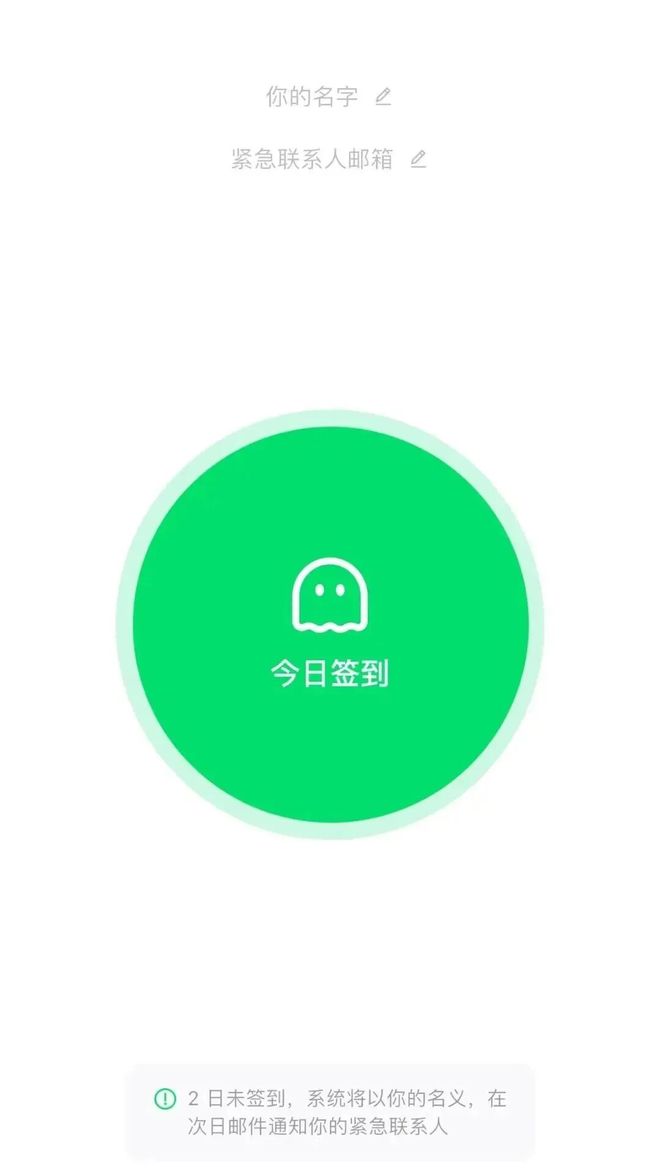 看到需求后,三人很快就做出了这款App,耗时不到一个月,成本只有1500元,2025年6月上线。功能也极其简单,只有签到打卡一个功能——用户每天需要在软件上签到,如果连续两天缺卡,系统会自动判定为异常状态,并向紧急联系人发送邮件。