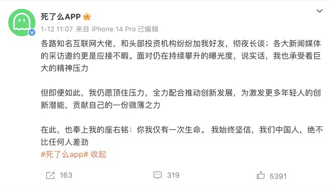 这是一位少见的,极其活跃的创始人,不拒绝任何访谈的机会,一直保持对外发声,前提是来访者能够卡准时间,打通电话。1月11日,小郭和另外两位95后一起创立的App,主动在微博回应了外界的关注,如果把这一天当作爆火的起始,在那之后的几天里,我们得以窥见巨大的流量如何冲刷而过。