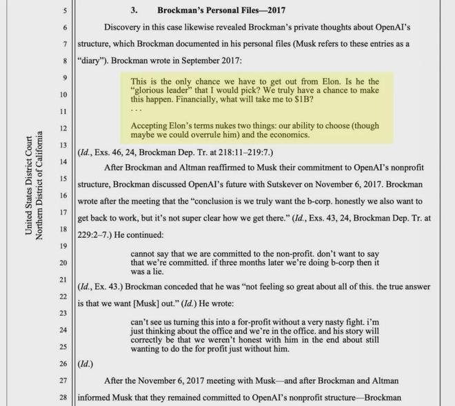 这些记录显示,Brockman 曾在日记中写道:“这是我们摆脱 Elon 的唯一机会…… 从财务角度,什么才能让我达到 10 亿美元?”并讨论转向营利结构,以避免马斯克的控制“破坏经济利益”。