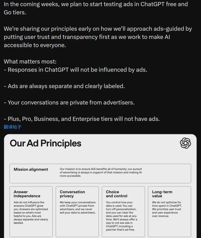 OpenAI 的公告指出,广告测试将在未来几周内率先在美国启动,能看到广告的用户包括免费版,还包括一种新的付费层级 ——ChatGPT Go 的用户。
