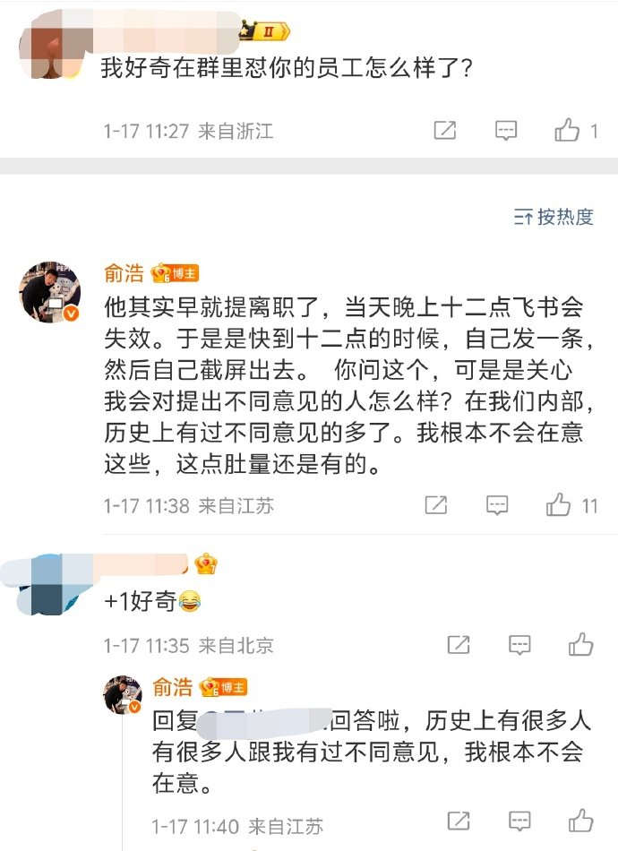 于是,有网友在俞浩上述博文评论区追问公开提出反对意见的员工现状。