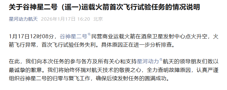 在此,我们向本次任务的参与各方及所有关心和支持星河动力航天的领导朋友们致以最诚挚的歉意。