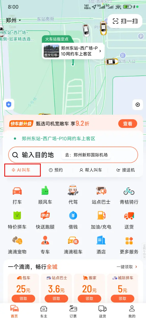 如果用户希望乘坐油车出行,可在滴滴打车页面中点击“AI叫车”,随后选择“油车”,就可以呼叫油车来接驾。