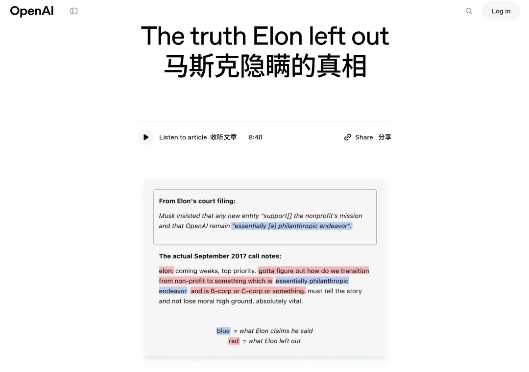 另一边,OpenAI再也坐不住了,直接在其官网上甩出了一篇名为《The truth Elon left out》(埃隆遗漏的真相)的檄文。