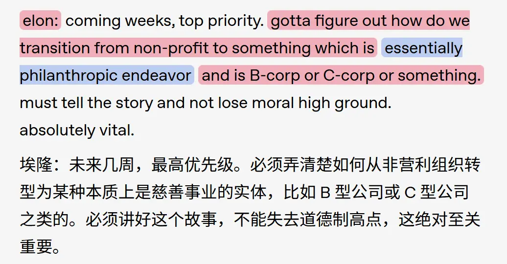 来看这份2017年9月的通话记录,马斯克说:“我们要弄清楚如何从非营利组织过渡到本质上是慈善事业的B-corp(共益企业)或C-corp(普通公司)……必须讲好这个故事,不能失去道德高地。”