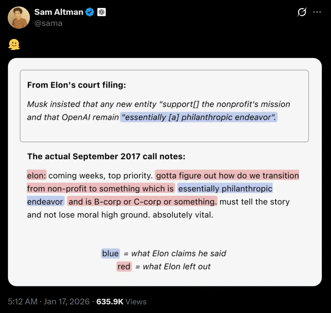 在马斯克的诉讼叙事中,他是非营利主义的坚定捍卫者,而奥特曼等人则是叛徒。