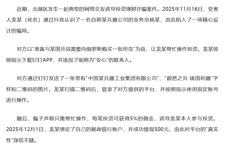 近期,湖南郴州北湖公安发布一起典型的网络交友诱导投资理财诈骗案件。受害人龙某(化名)认识了一名自称某兵器公司业务员的网友,对方以“准备与某国开战需要向俄罗斯购买一批坦克”为由,让龙某帮忙操作投资。