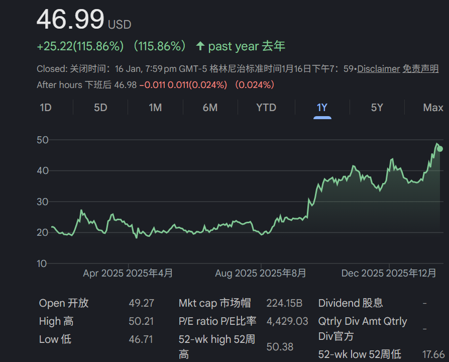 过去两年中,NVIDIA、AMD都是AI浪潮中的受益者,CPU巨头Intel则错失这一机会,2024年股价跌了60%,但是现在Intel回来了。Intel的股价在2025年大涨84%,2026开年也就半个月时间又涨了31%,一年多时间轻松翻倍,与此前的萎靡相比表现已经脱胎换骨,被投资者形容为死而复生。