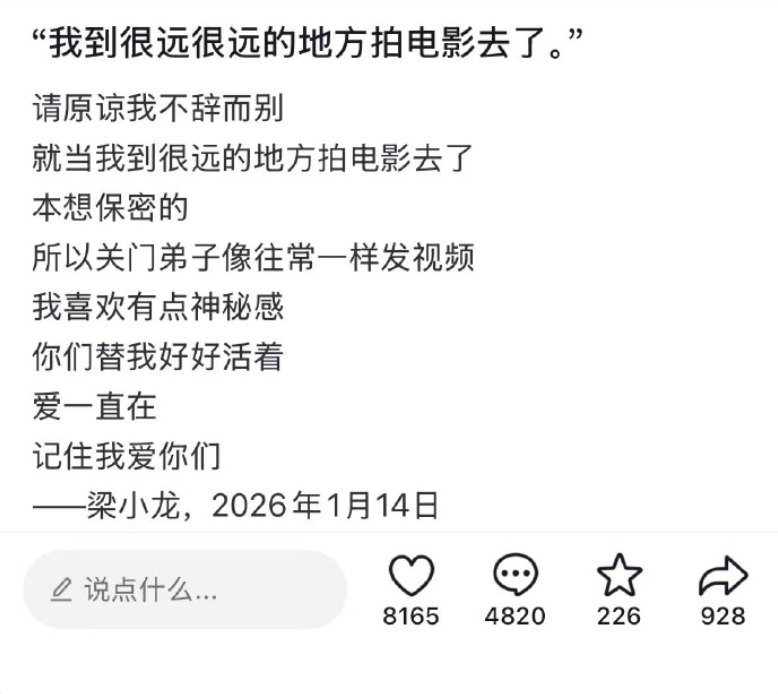 梁小龙账号发告别信:原谅我不辞而别