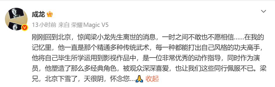 1月18日,成龙微博发文悼念:“惊闻梁小龙先生离世的消息,一时之间不敢也不愿相信……在我的记忆里,他一直是那个精通多种传统武术,每一种都能打出自己风格的功夫高手,他将自己毕生所学运用到影视作品中,是一位非常优秀的动作指导,同时作为演员,他塑造了那么多经典角色,被观众深深喜爱,也让我们这些同行佩服不已。