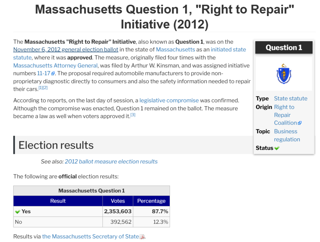 就比如 2012 年的时候美国的马萨诸塞州的民间组织维修权联盟就发起了一项提案,要求本州的车主和独立维修机构们,可以获取跟车企售后部门一样的车辆诊断和维修信息。