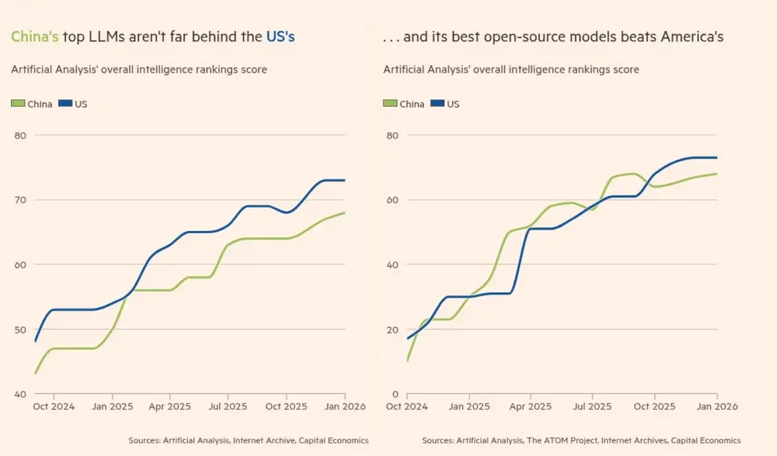 以DeepSeek、阿里巴巴、月之暗面等为代表的中国企业正紧追不舍。根据模型评估机构Artificial Analysis的数据,中国顶尖大语言模型与美国的性能差距正在快速缩小。