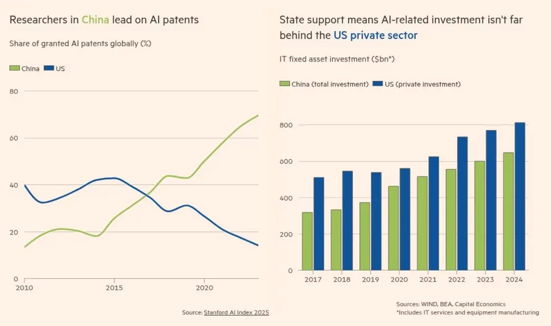 尽管美国私营部门在AI领域的投资规模大于中国,但若将中国的财政支持纳入考量,双方实际投入资本的差距并不明显。