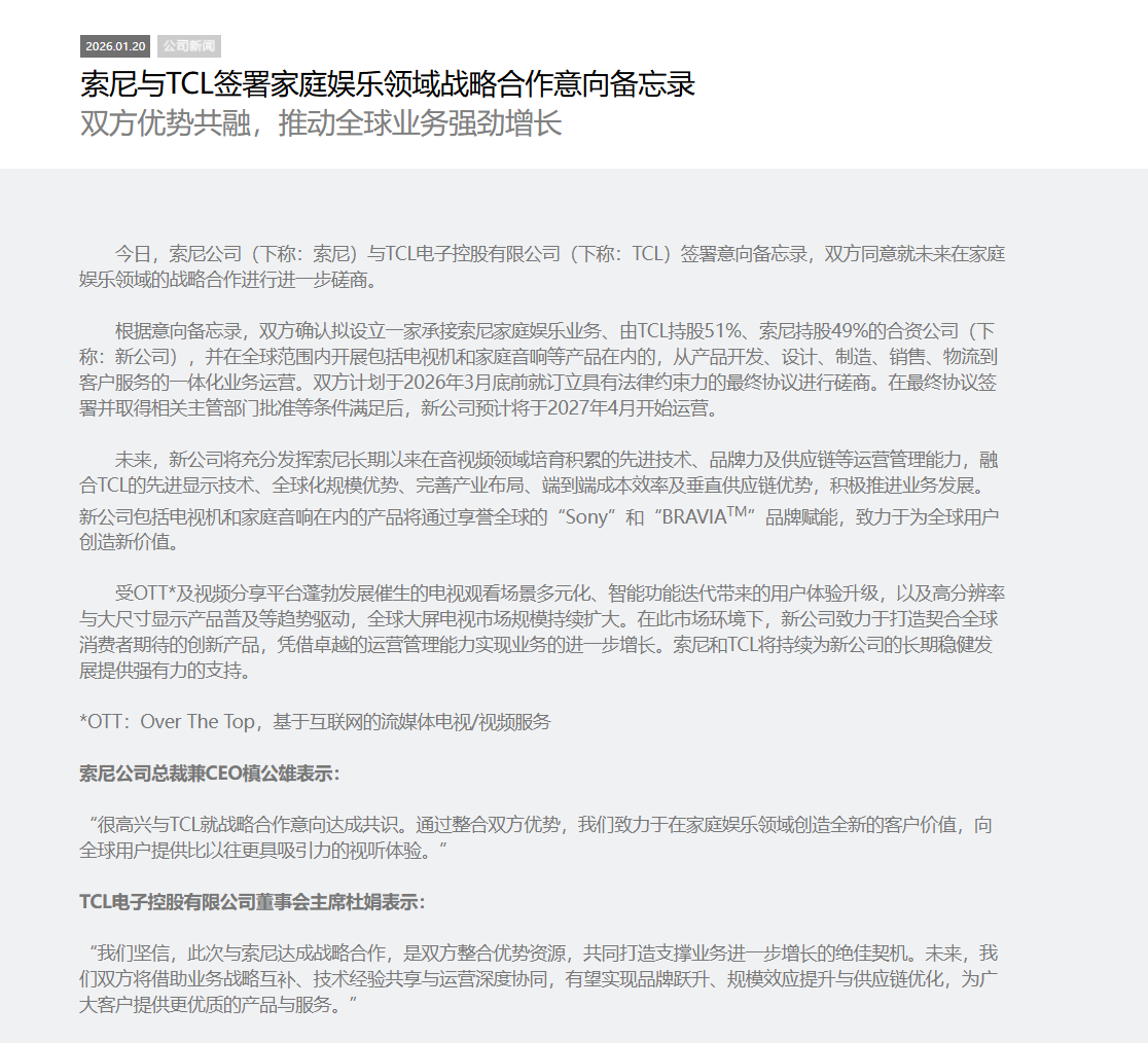今日,索尼公司与TCL电子控股有限公司签署意向备忘录,双方同意就未来在家庭娱乐领域的战略合作进行进一步磋商。根据意向备忘录,双方确认拟设立一家承接索尼家庭娱乐业务、由TCL持股51%、索尼持股49%的合资公司,并在全球范围内开展包括电视机和家庭音响等产品在内的,从产品开发、设计、制造、销售、物流到客户服务的一体化业务运营。