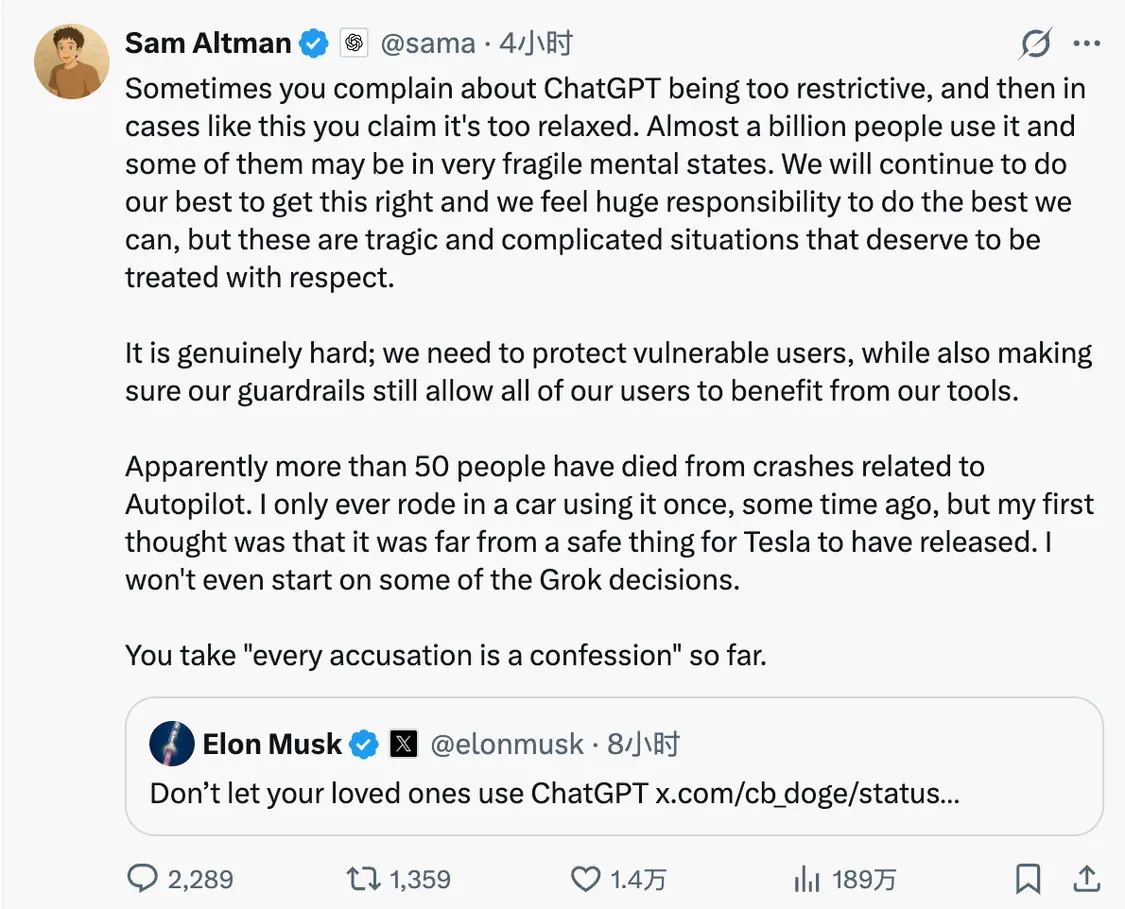 奥特曼随即回击,先是捍卫ChatGPT及OpenAI保护用户的初衷,继而抨击特斯拉的自动辅助驾驶技术(Autopilot),称其不安全。