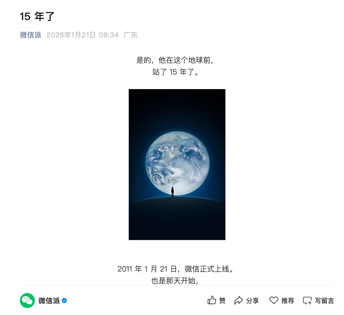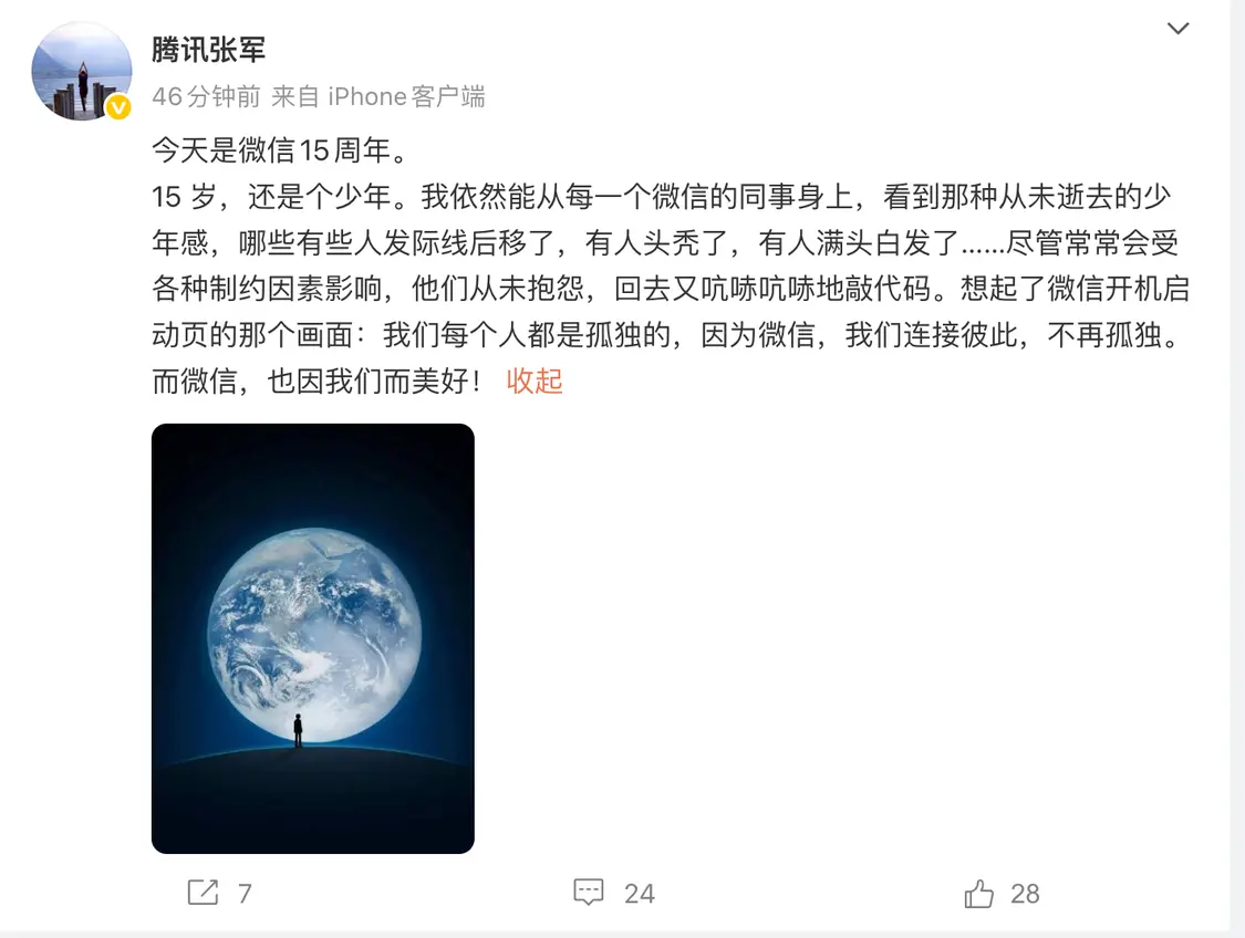 1月21日,今天是微信15周年。2011年1月21日,微信发布1.0测试版。对此,腾讯公司公关总监张军发文称,“15岁,还是个少年。我依然能从每一个微信的同事身上,看到那种从未逝去的少年感,有些人发际线后移了,有人头秃了,有人满头白发了……尽管常常会受各种制约因素影响,他们从未抱怨,回去又吭哧吭哧地敲代码。想起了微信开机启动页的那个画面——我们每个人都是孤独的,因为微信,我们连接彼此,不再孤独。而微信,也因我们而美好。”