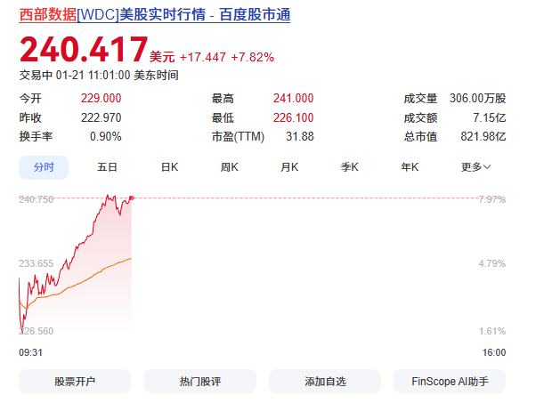 当日个股涨幅显著:西部数据涨超7%领涨,美光科技涨超6%,闪迪涨超5%,希捷科技涨超4%。